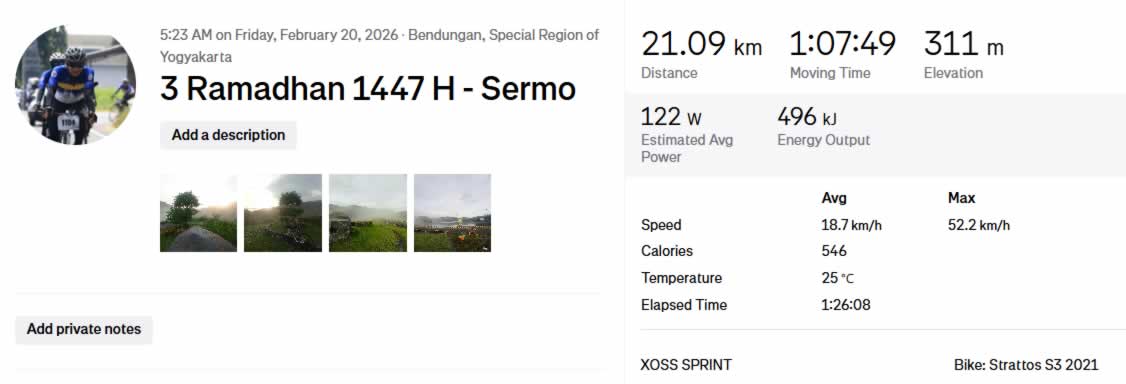 Embun Pagi Cycling Community. Kamis pagi, 19 Februari 2026, alarm belum selesai berbunyi, sepeda sudah siap diajak kompromi. Tepat pukul 05.23 WIB, roda mulai berputar dari Rumah Wates. Kali ini bukan rombongan — ini solo ride menuju medan yang sedikit lebih serius: Waduk Sermo.