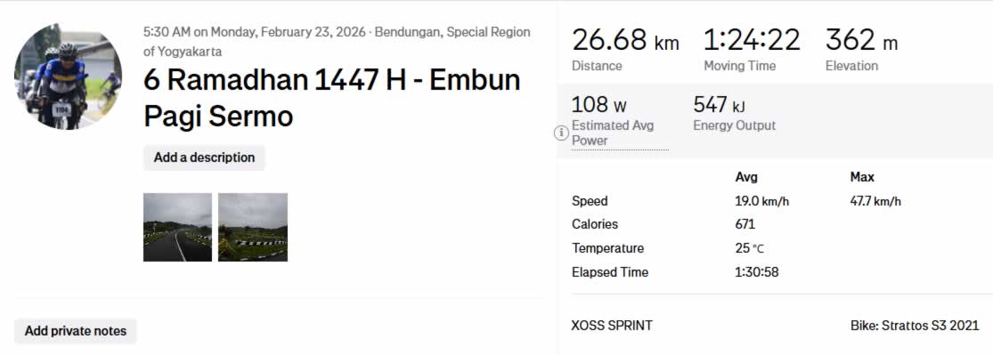 Senin pagi, 23 Februari 2026, pukul 05.30 WIB, roda mulai berputar dari Rumah Wates. Udara 25°C terasa segar, khas pagi Kulon Progo. Jalanan masih lengang — waktu terbaik untuk berdamai dengan tanjakan.