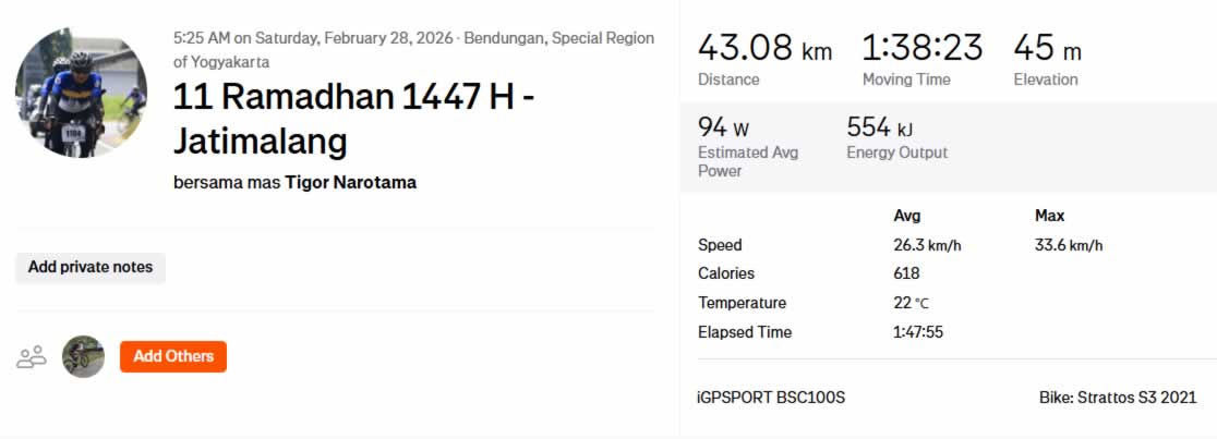 Dengan menggunakan armada Strattos S3 2021, para peserta berhasil menyelesaikan rute sepanjang 43 km ini dengan lancar. Suhu pagi yang sejuk di angka 22°C sangat mendukung kondisi fisik para goweser yang sedang menjalankan ibadah puasa di 11 Ramadhan 1447 H.