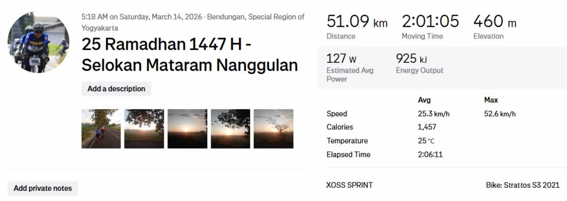 Gowes kali ini lengkap—jarak lumayan, elevasi dapet, dan suasana jalur Selokan Mataram jadi highlight yang bikin nagih.