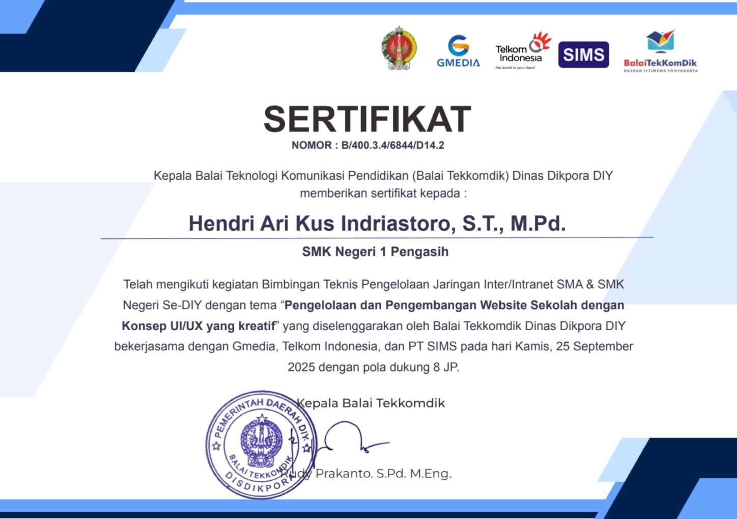 Bimbingan Teknis (BIMTEK) Pengelolaan Jaringan Inter/Intranet Sekolah Angkatan 3, kerjasama antara Balai Tekkomdik Yogyakarta dengan PT Telkom.
