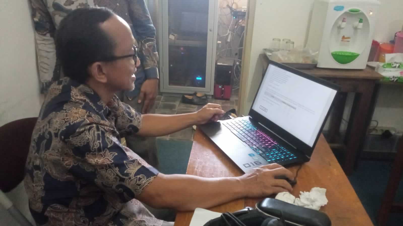Foto 1: Proktor sedang mengoperasikan Server AdminCBT dan memantau status peserta ujian. Teknisi menginstal Exambrowser pada komputer peserta. Tim Proktor dan Teknisi berkoordinasi saat simulasi berlangsung.