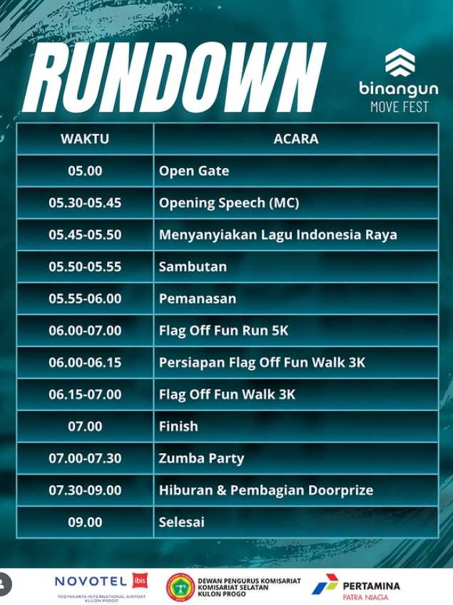 Kulon Progo, 9 November 2025 — Pagi yang cerah di Hotel Novotel Yogyakarta International Airport (YIA) menjadi saksi kemeriahan ajang olahraga dan kebersamaan bertajuk BINANGUN MOVE FEST 2025. Kegiatan ini diinisiasi oleh Dewan Pengurus Komisariat Selatan Kulon Progo bekerja sama dengan Pertamina Patra Niaga dan Hotel Novotel YIA, sebagai bentuk ajakan kepada masyarakat untuk hidup sehat, aktif, dan berenergi positif.