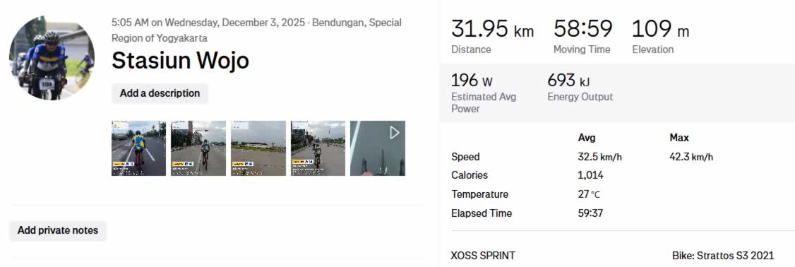 Gowes berlangsung cepat dan efisien, dengan intensitas tinggi pada jalur datar Toyan–Congot yang mendukung speed play. Lalu lintas ringan memberi ruang lebih luas untuk menjaga kecepatan stabil. Setibanya di Stasiun Wojo, gowes dilanjutkan dengan putar balik menuju rumah melalui jalur yang sama.
