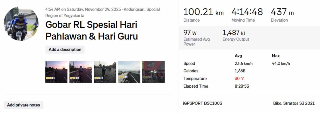 Sabtu, 29 November 2025, Gowes spesial hari ini yang diselenggarkan Rodalink Janti menjadi momen istimewa dalam rangka memperingati Hari Pahlawan sekaligus Hari Guru. Bersama rekan gowes setia Tigor Narotama, perjalanan dilaksanakan dengan rute panjang menyusuri kota hingga kembali ke Kulon Progo. Cuaca cerah, jalanan masih tenang di pagi buta, dan suasana Jogja yang hangat memberikan energi positif sepanjang perjalanan.
