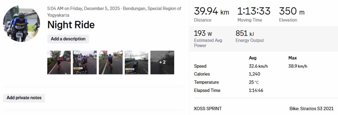 Gowes kali ini berjalan cepat dan efisien, dengan ritme sedang sepanjang Deandeles hingga Jatimalang. Kecepatan rata-rata 32.6 km/jam menunjukkan performa yang baik untuk sesi embun pagi. Cuaca cerah dan angin pantai membuat perjalanan terasa ringan meskipun rute cukup menantang.