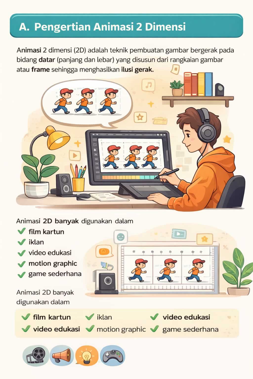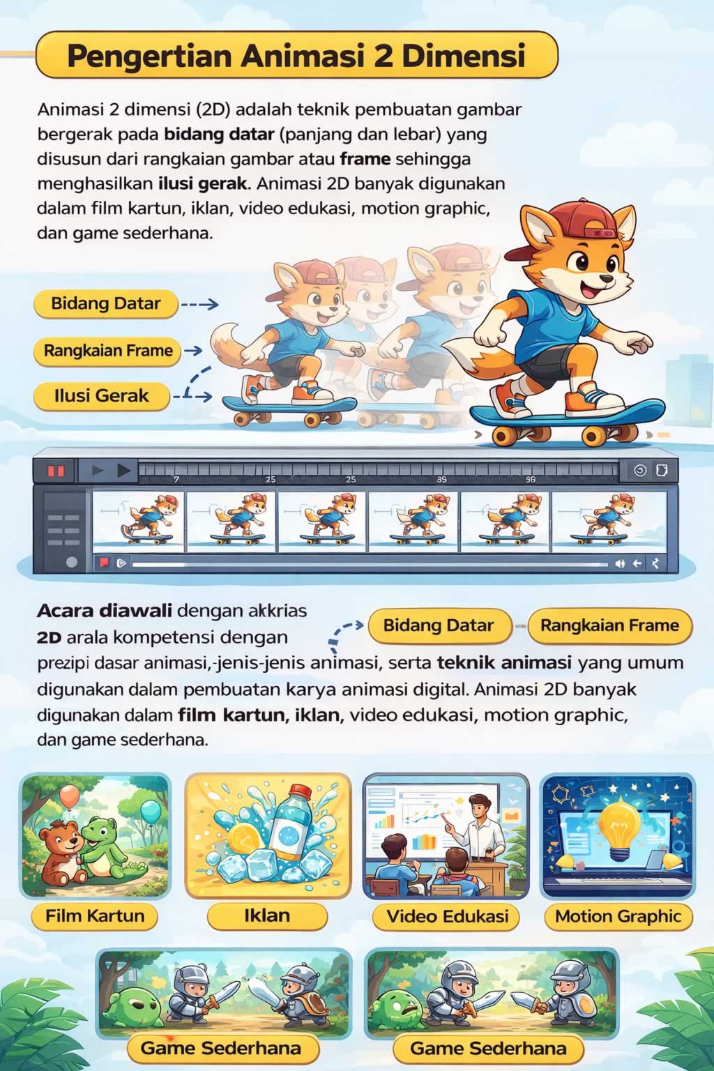 Animasi 2 dimensi merupakan dasar penting dalam dunia animasi dan desain visual. Dengan memahami prinsip, teknik, dan alur kerja animasi 2D, siswa mampu menciptakan karya animasi yang kreatif dan komunikatif.