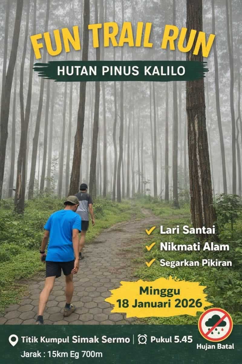 Kaligesing, Purworejo – Minggu, 18 Januari 2026. Komunitas Sobo Alas kembali menggelar kegiatan olahraga alam terbuka bertajuk Fun Trail Run Hutan Pinus Kalilo pada Minggu, 18 Januari 2026. Kegiatan ini mengombinasikan olahraga, eksplorasi alam, dan kebersamaan di kawasan perbukitan Menoreh, tepatnya di Hutan Pinus Kalilo, Kaligesing, Purworejo.