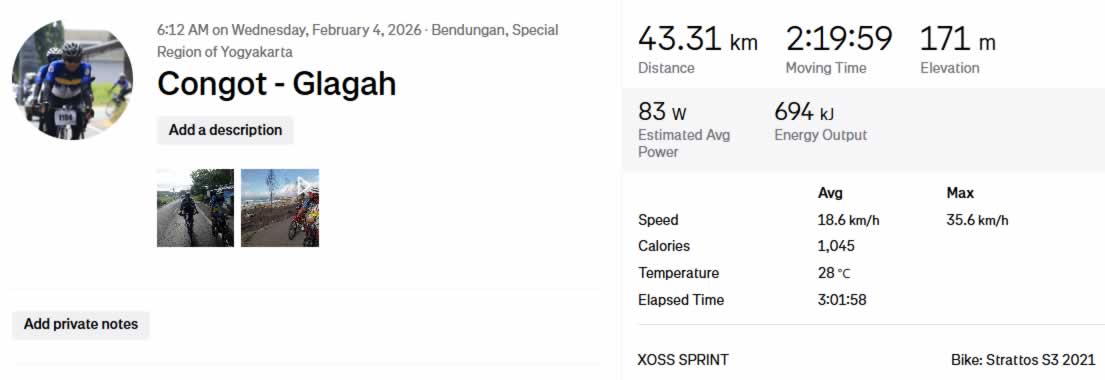 Dari sisi kebugaran, gowes ini menghasilkan pembakaran sekitar 1.045 kalori, dengan suhu udara rata-rata 28°C. Total waktu aktivitas (elapsed time) mencapai 3 jam 1 menit 58 detik, termasuk jeda singkat untuk istirahat dan menikmati suasana pesisir. Aktivitas direkam menggunakan perangkat XOSS Sprint dengan sepeda Strattos S3 2021.