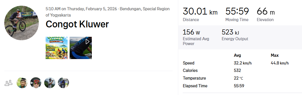 Berdasarkan data aktivitas, total jarak tempuh mencapai 30,01 km dengan waktu bergerak 55 menit 59 detik. Kecepatan rata-rata tercatat 32,2 km/jam, dengan kecepatan maksimum mencapai 44,8 km/jam di beberapa segmen lurus. Ride ini juga menghasilkan estimasi tenaga rata-rata 156 watt dan total energi 523 kJ, serta pembakaran sekitar 532 kalori. Kondisi cuaca cukup ideal dengan suhu sekitar 22°C, membuat kayuhan terasa ringan dan menyenangkan. Total elevasi tercatat 66 meter, menunjukkan rute yang relatif datar dan cocok untuk ride cepat namun tetap santai.