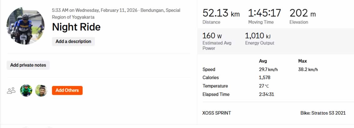 Berdasarkan data aktivitas, total jarak tempuh ride kali ini mencapai 52,13 km dengan waktu bergerak 1 jam 45 menit 17 detik. Elevasi tercatat 202 meter, cukup memberikan variasi medan tanpa terlalu menguras tenaga. Kecepatan rata-rata berada di angka 29,7 km/jam, dengan kecepatan maksimum mencapai 38,2 km/jam. Total energi yang dikeluarkan sekitar 1.010 kJ dengan estimasi power rata-rata 160 watt, menunjukkan ritme gowes yang stabil dan konsisten sepanjang perjalanan.