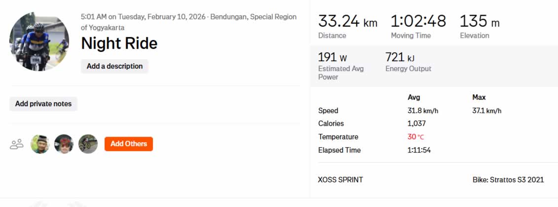 Berdasarkan data aktivitas ride, total jarak tempuh mencapai 33,24 km dengan waktu bergerak 1 jam 2 menit 48 detik. Elevasi tercatat 135 meter, memberikan variasi medan ringan yang cukup menantang. Kecepatan rata-rata berada di angka 31,8 km/jam, dengan kecepatan maksimum mencapai 37,1 km/jam. Estimasi power rata-rata mencapai 191 watt dengan total energi yang dikeluarkan sekitar 721 kJ, menunjukkan ritme gowes yang cukup intens namun tetap terkontrol.